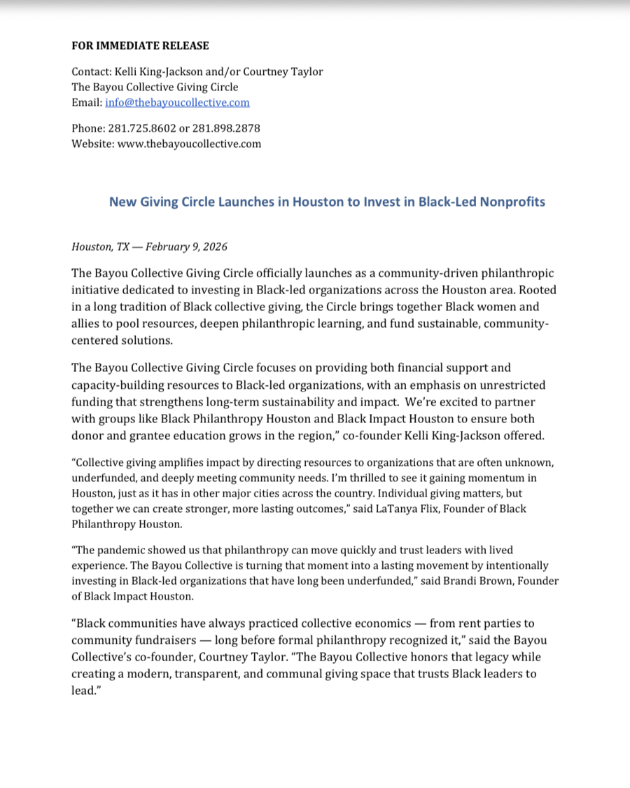 Join us for a one-hour virtual session to learn about The Bayou Collective, a new giving circle created by Courtney Taylor and Kelli King-Jackson to support the sustainability of Black-led organizations in Houston. We’ll walk through our vision, membership structure, funding focus, and what it means to participate as a member. Bring your questions and your curiosity as we explore this collective giving opportunity.